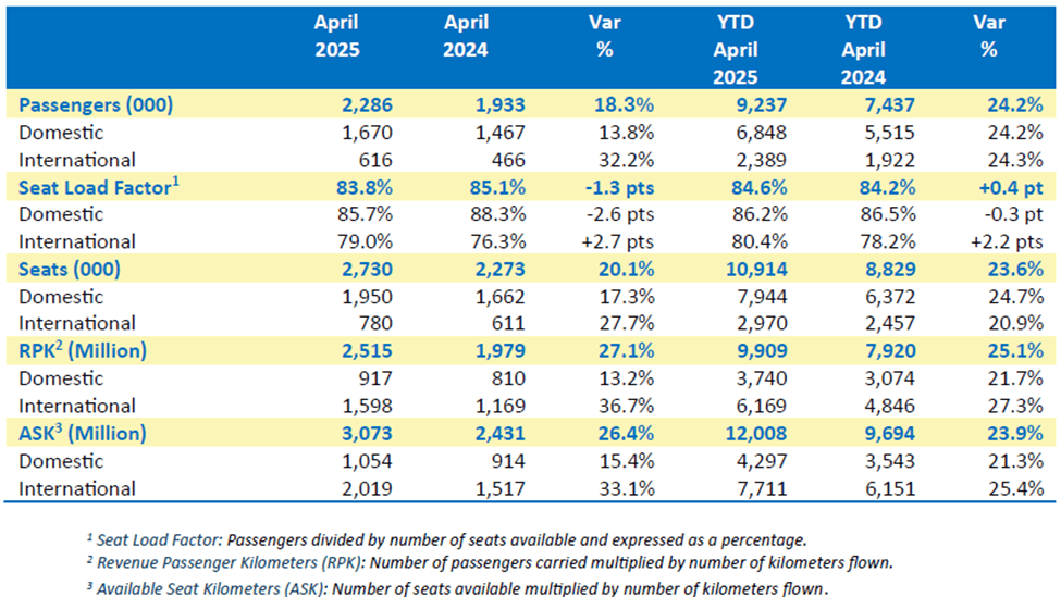 Cebu Pacific (CEB) continues to soar in 2025, carrying 2.3 million passengers in April — an 18.3% jump from the same month last year. The airline also reported a strong seat load factor (SLF) of 83.8%, thanks to a 20.1% increase in seat availability.