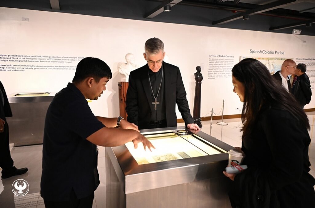 Papal Nuncio to the Philippines Archbishop Charles John Brown explores the Bangko Sentral ng Pilipinas Money Museum during his visit on September 2, 2025. The exhibit highlights the evolution of Philippine currency through rare artifacts and historical pieces. He was joined by Monetary Board Member Benjamin E. Diokno, BSP Museum Researcher Lauro de los Santos, and Budget Undersecretary Margaux Salcedo.