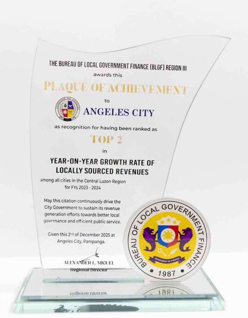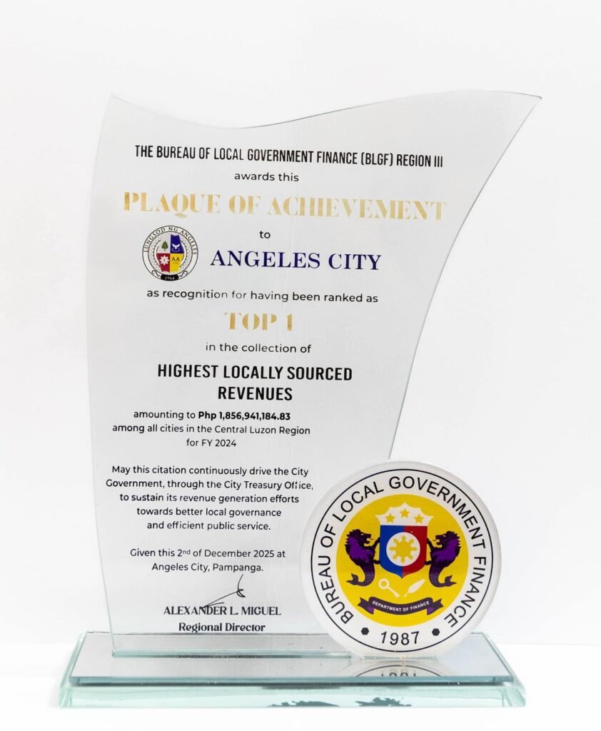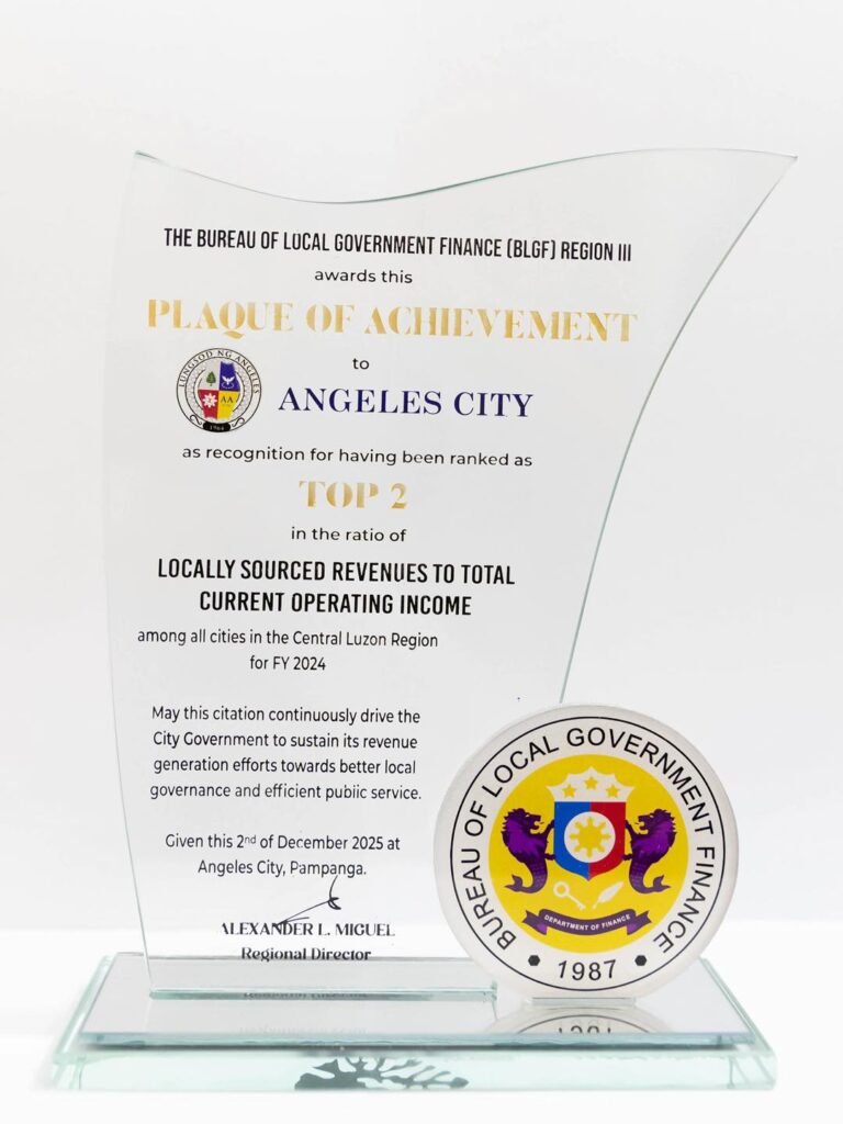Angeles City has been recognized by the Bureau of Local Government Finance (BLGF) Region III for its outstanding revenue performance in Fiscal Year 2024, receiving multiple Plaques of Achievement on December 2, 2025.