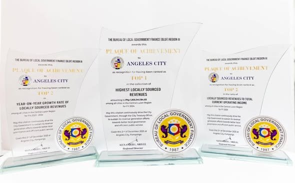 Angeles City has been recognized by the Bureau of Local Government Finance (BLGF) Region III for its outstanding revenue performance in Fiscal Year 2024, receiving multiple Plaques of Achievement on December 2, 2025.