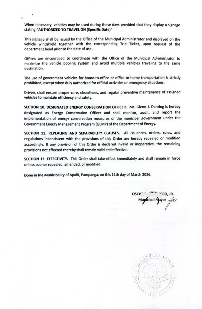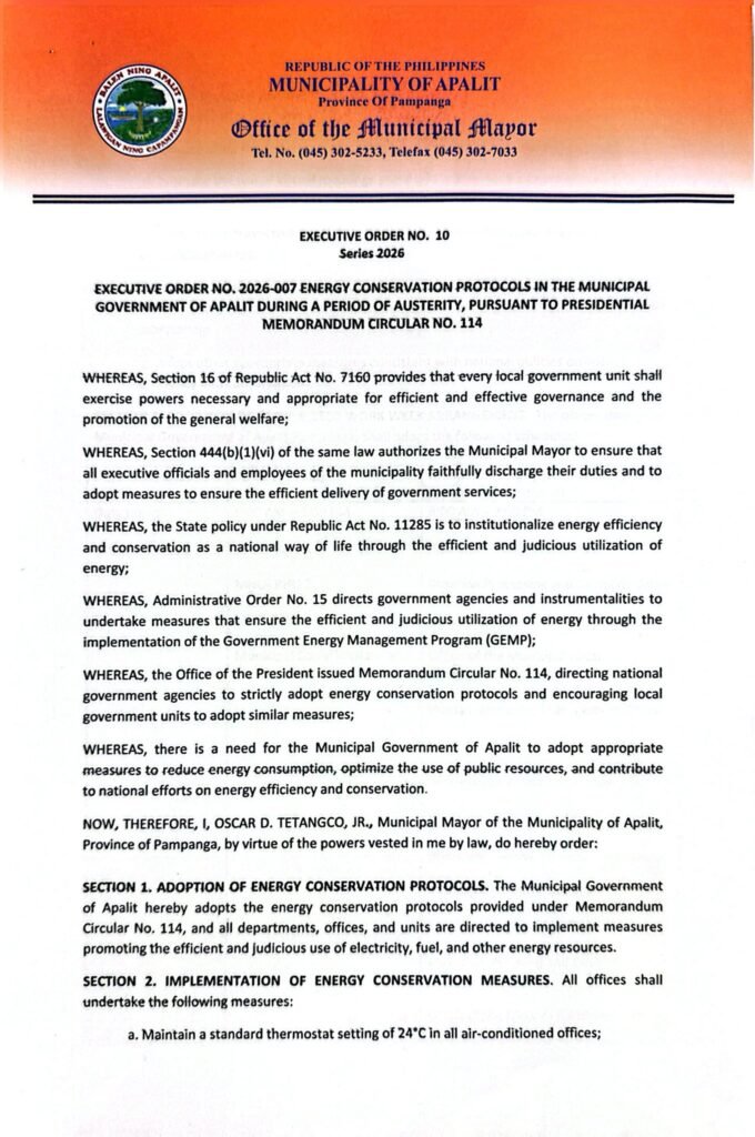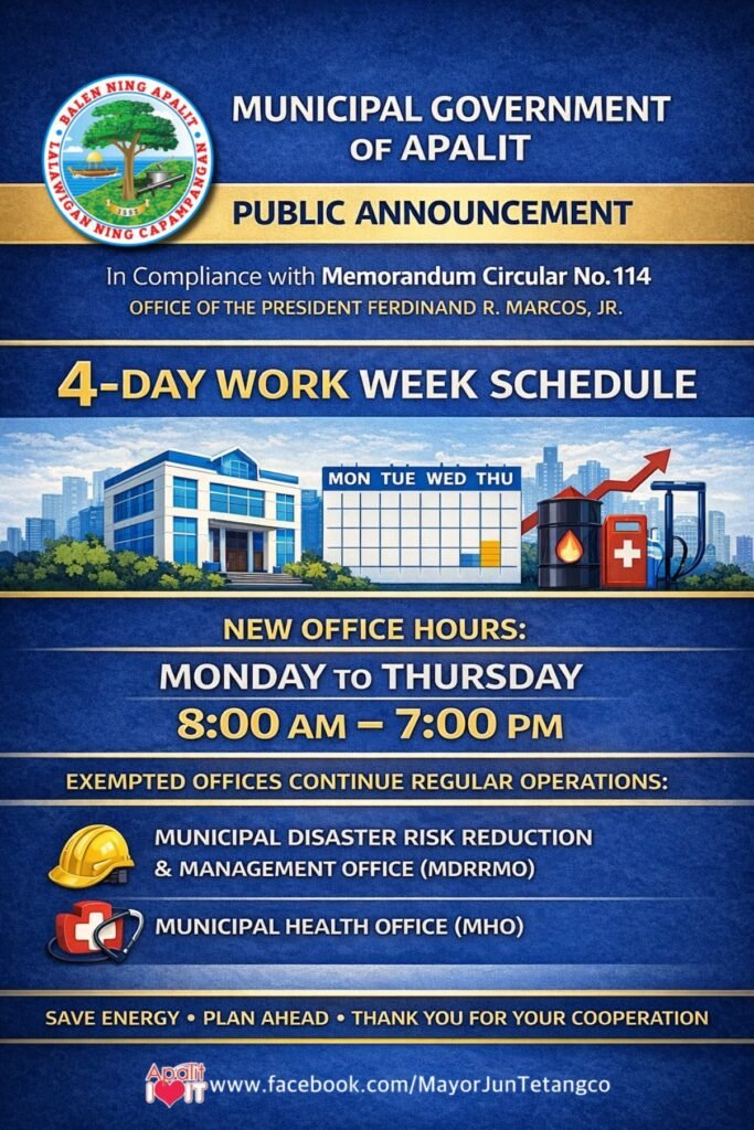 The Municipal Government of Apalit will implement a temporary change in office working hours beginning March 12, 2026, in compliance with Memorandum Circular No. 114 issued by the Office of the President of the Philippines at Malacañang Palace.