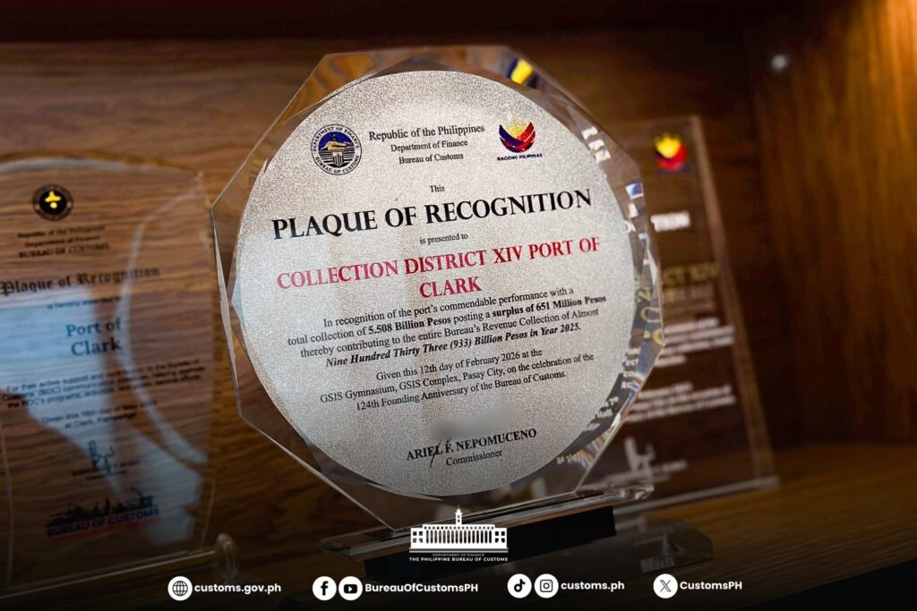 Bureau of Customs-Port of Clark was recognized for surpassing its assigned 2025 collection target. The recognition was done during the Bureau of Customs’ 124th Founding Anniversary.