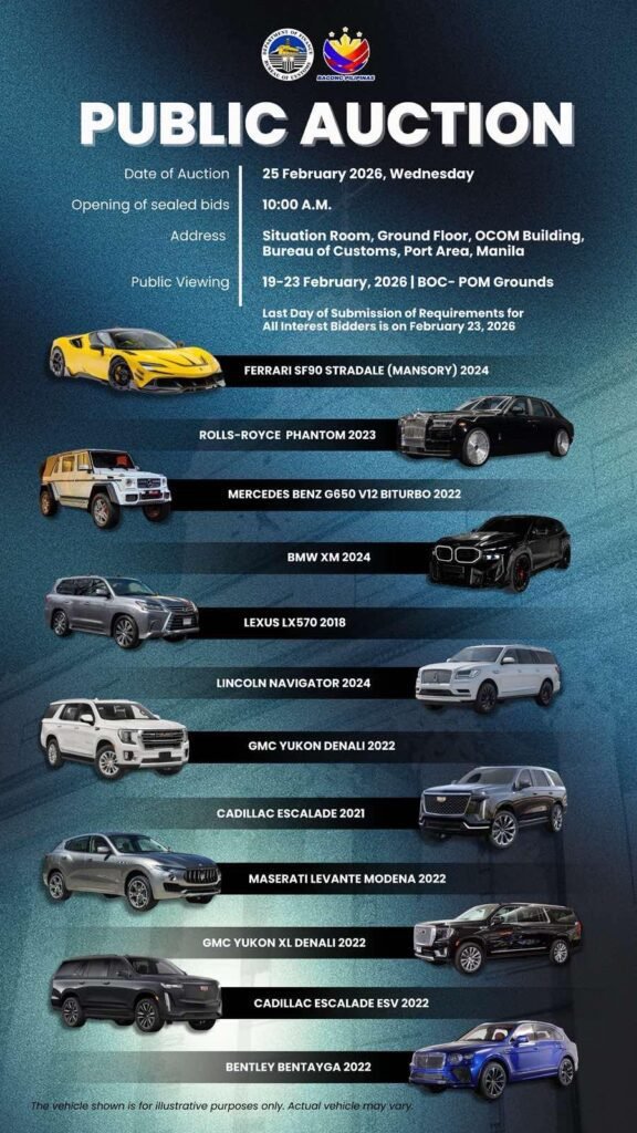 The Bureau of Customs – Port of Manila (BOC-POM) will hold a public auction through sealed bidding for twelve (12) luxury vehicles on February 25, 2026, at 10:00 a.m. at the Situation Room, Ground Floor, OCOM Building, BOC, Port Area, Manila.