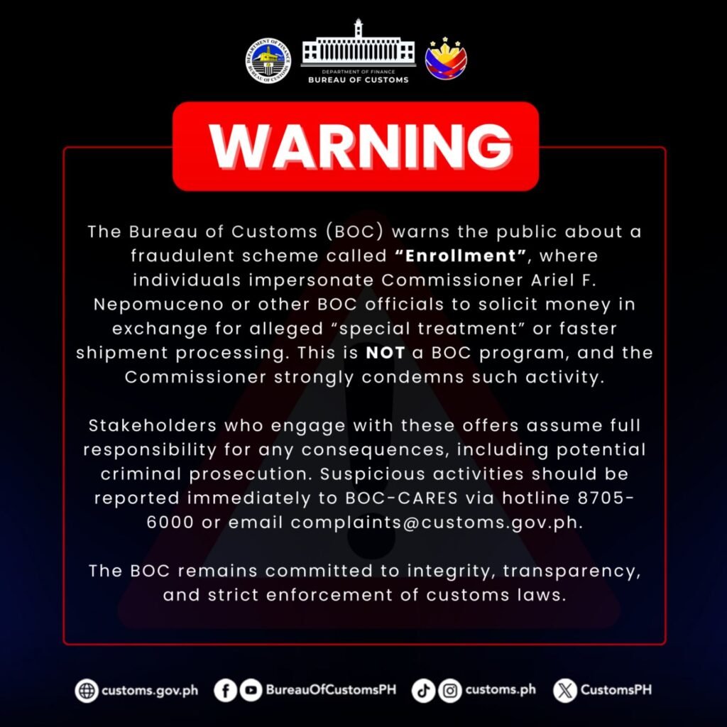 The agency said it has received reports of a scheme dubbed “Enrollment,” falsely linked to the BOC. The scam allegedly promises preferential treatment to importers and brokers willing to pay grease money.