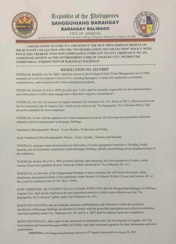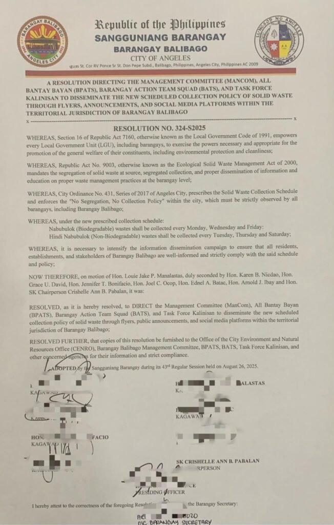 The second, Barangay Resolution No. 324-S2025, directs the Balibago Management Committee (MANCOM), Barangay Peacekeeping Action Teams (BPATS/BATS), and Task Force Kalinisan to widely disseminate the collection schedule through flyers, public announcements, and social media platforms across the barangay.