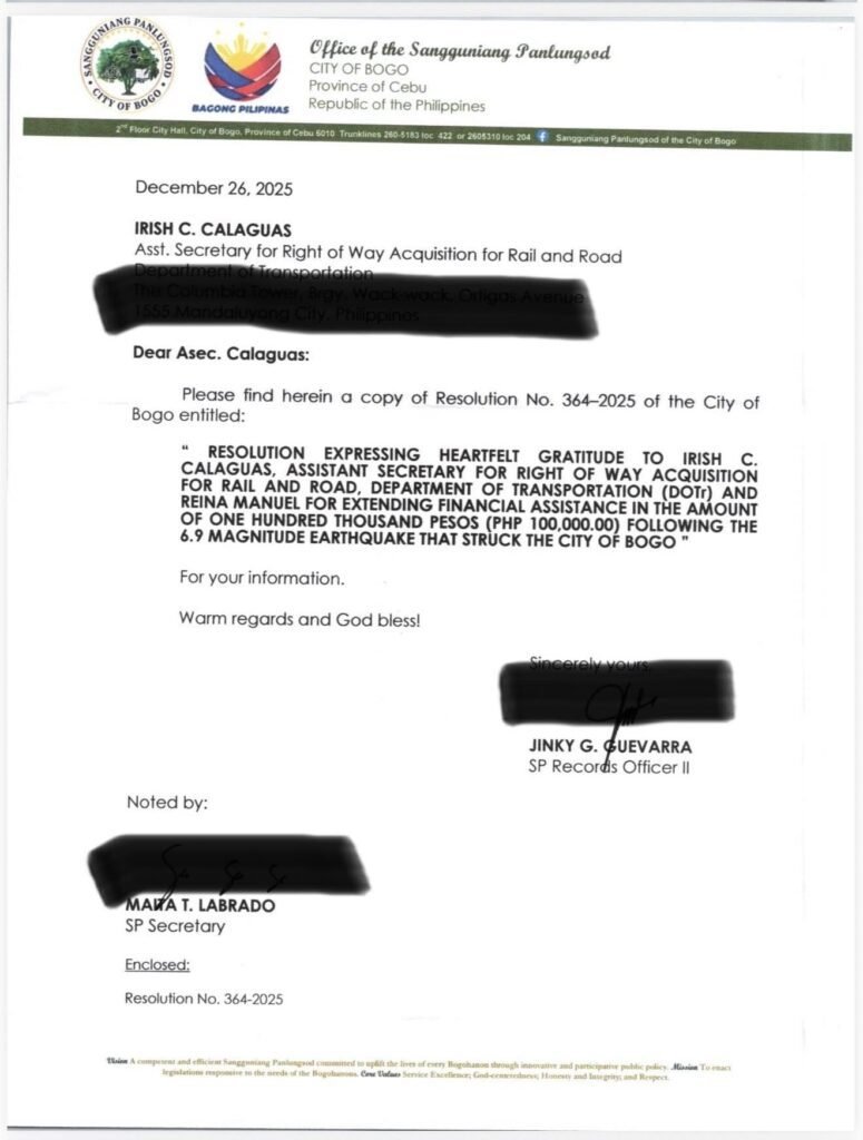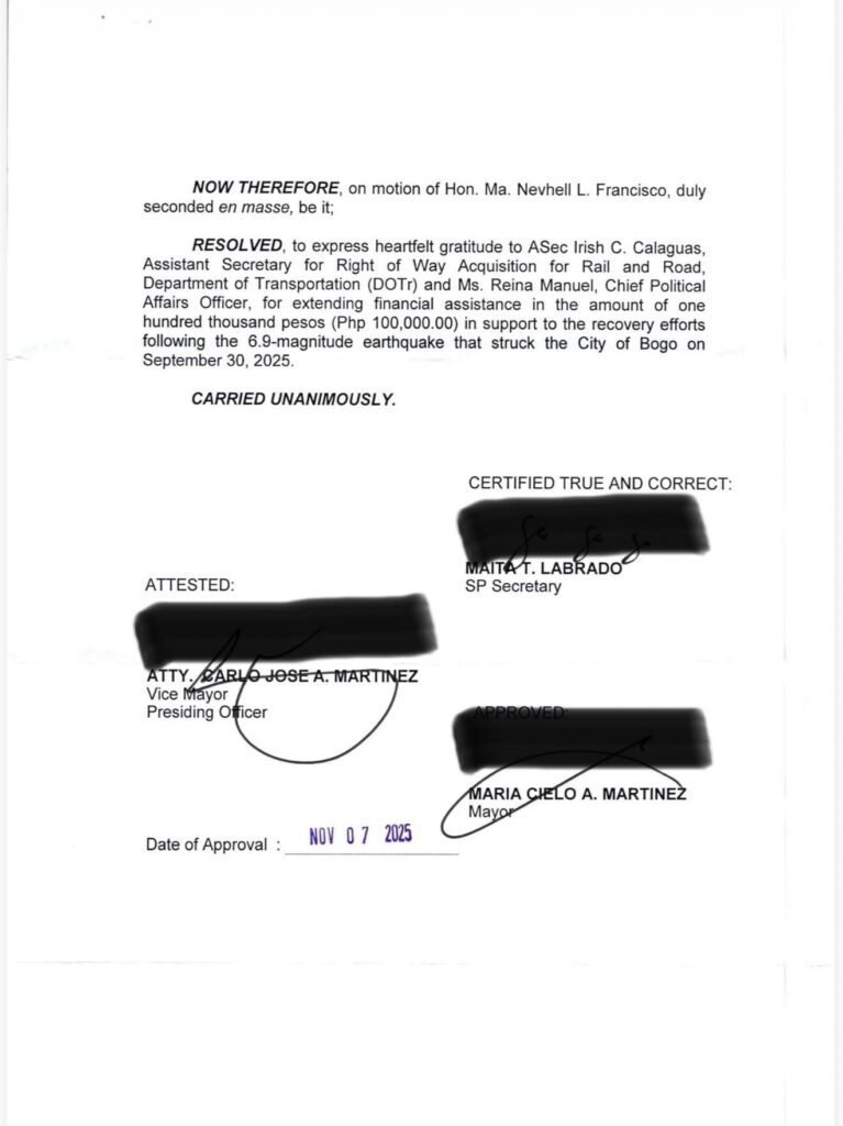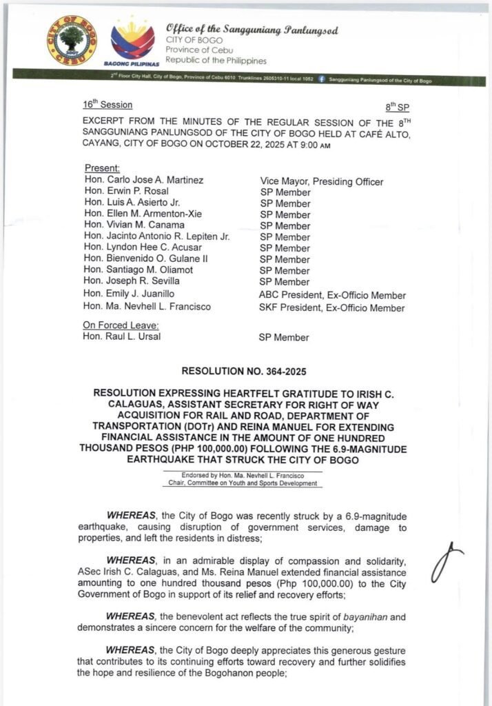 The Sangguniang Panlungsod of Bogo City, Cebu, through Resolution No. 364-2025, formally expressed gratitude to DOTr Assistant Secretary IC Calaguas and Chief Political Affairs Officer Reina Manuel for their P100,000 personal donation to victims of the 6.9-magnitude earthquake that struck Bogo City on September 30, 2025.