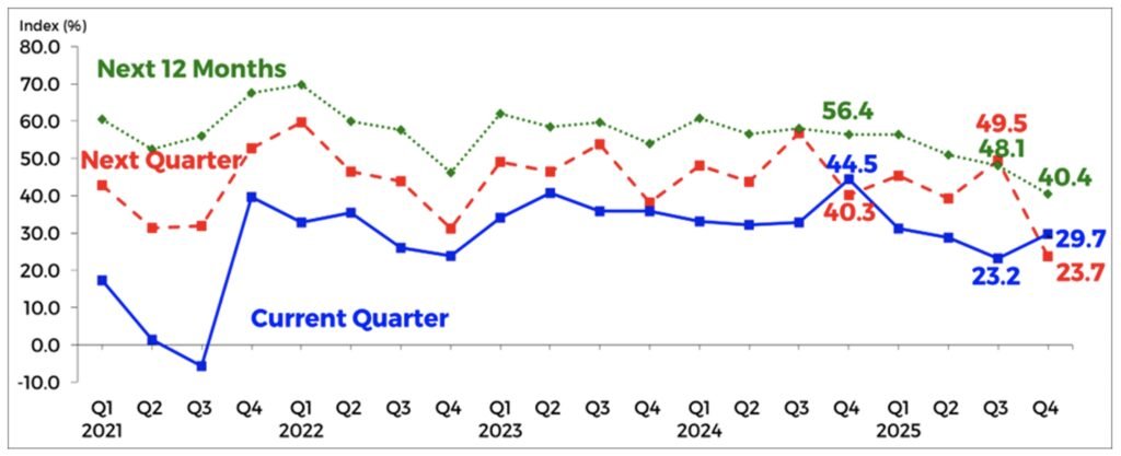 Business outlook for the next quarter and the next 12 months remained positive but showed a notable decline. The confidence index for Q1 2026 slipped to 23.7 percent from 49.5 percent previously, while the year-ahead CI eased to 40.4 percent from 48.1 percent.