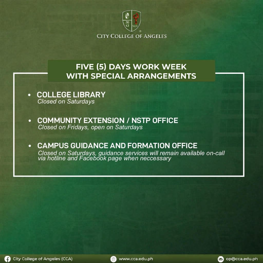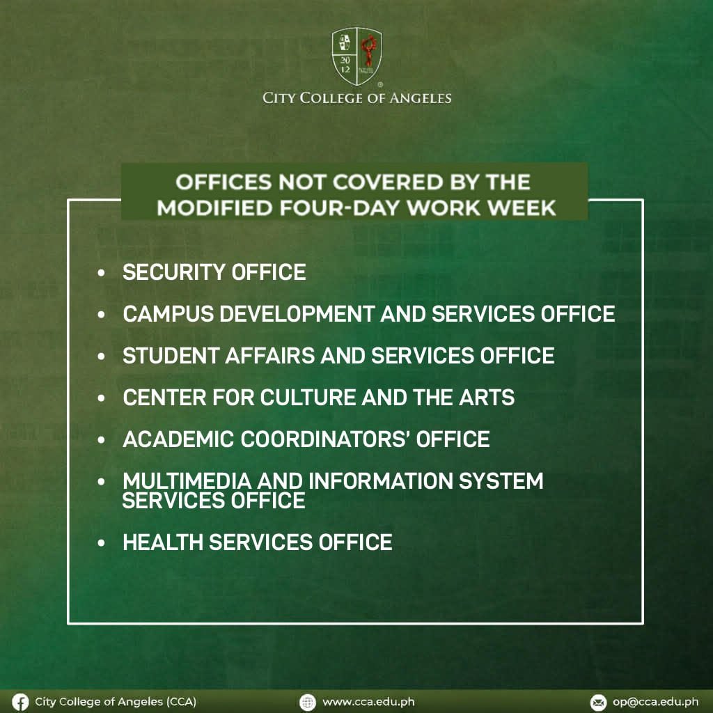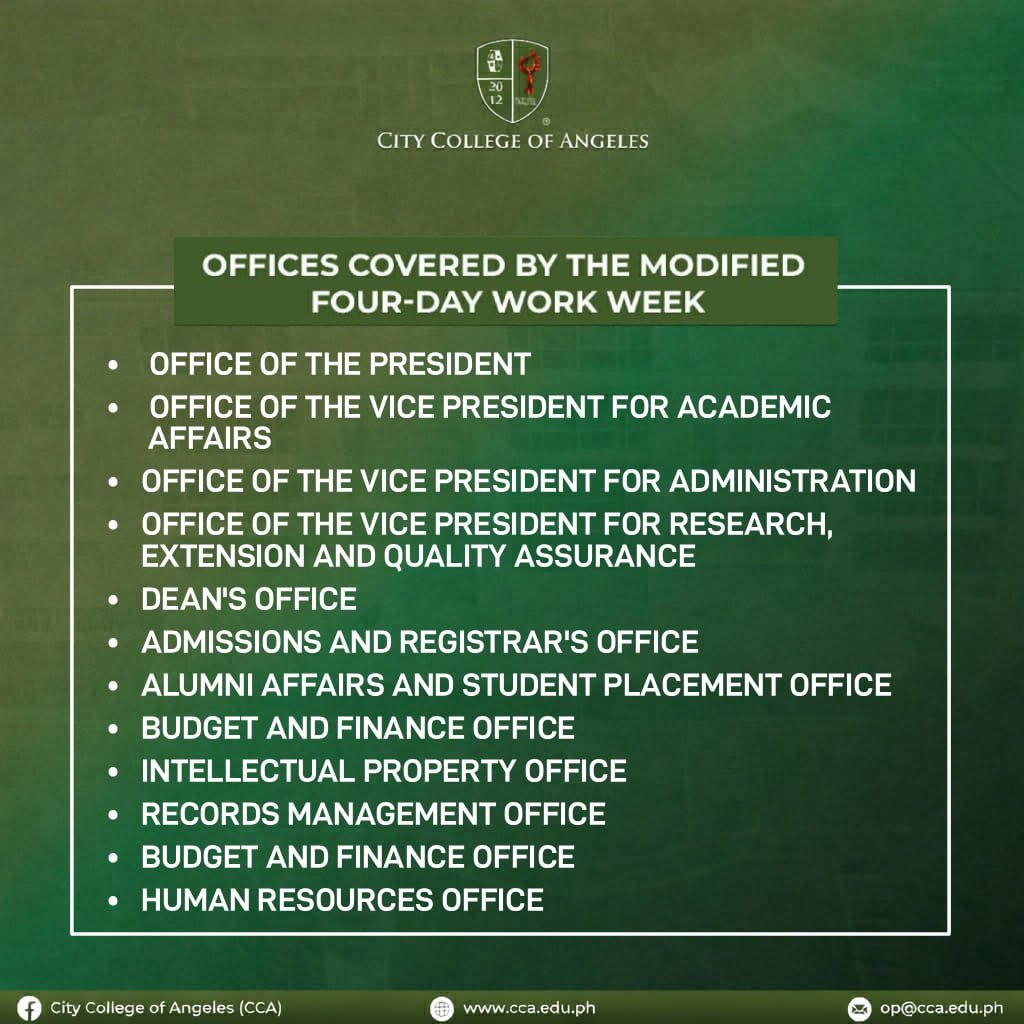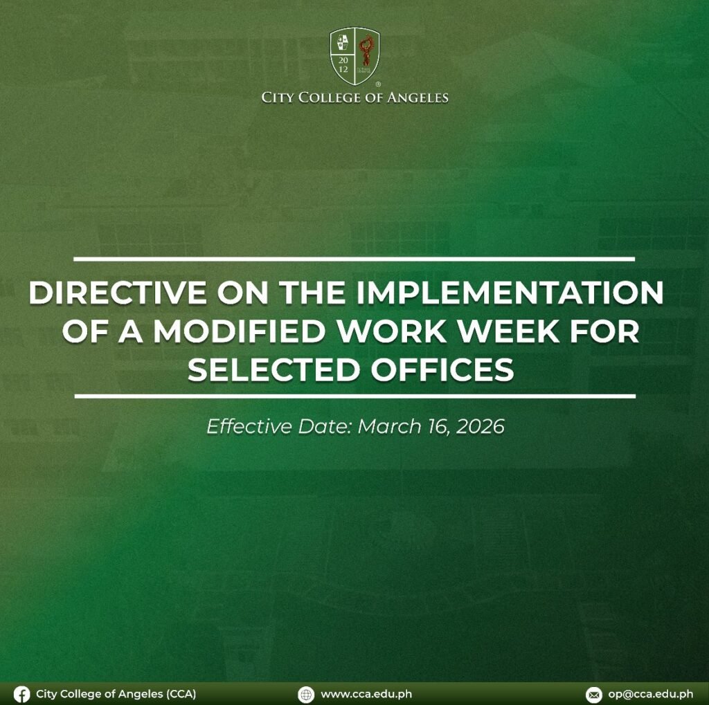City College of Angeles (CCA) has announced the implementation of a modified four-day work week for selected offices starting March 16, 2026, in compliance with Memorandum Circular No. 114, s. 2026 issued by Malacañang.