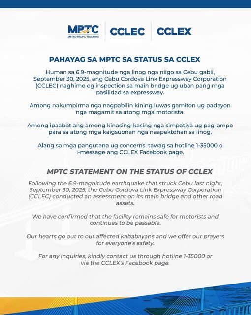 The Cebu Cordova Link Expressway Corporation (CCLEC) assured the public that the Cebu-Cordova Link Expressway remains safe and passable following the 6.9-magnitude earthquake that shook Cebu on September 30, 2025.