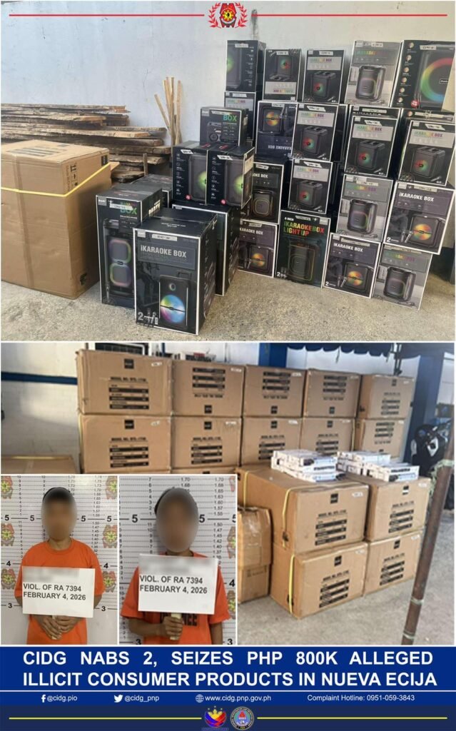 The operation led to the arrest of two male suspects, identified only as “Cholo” and “Oscar”, both residents of Cabanatuan City, and the confiscation of alleged substandard consumer products valued at Php 800,000. Confiscated items included 50 LED multifunctional lithium lamp tubes and 80 assorted audio speakers that lacked the minimum labeling requirements set by the Department of Trade and Industry–Bureau of Philippine Standards (DTI–BPS).