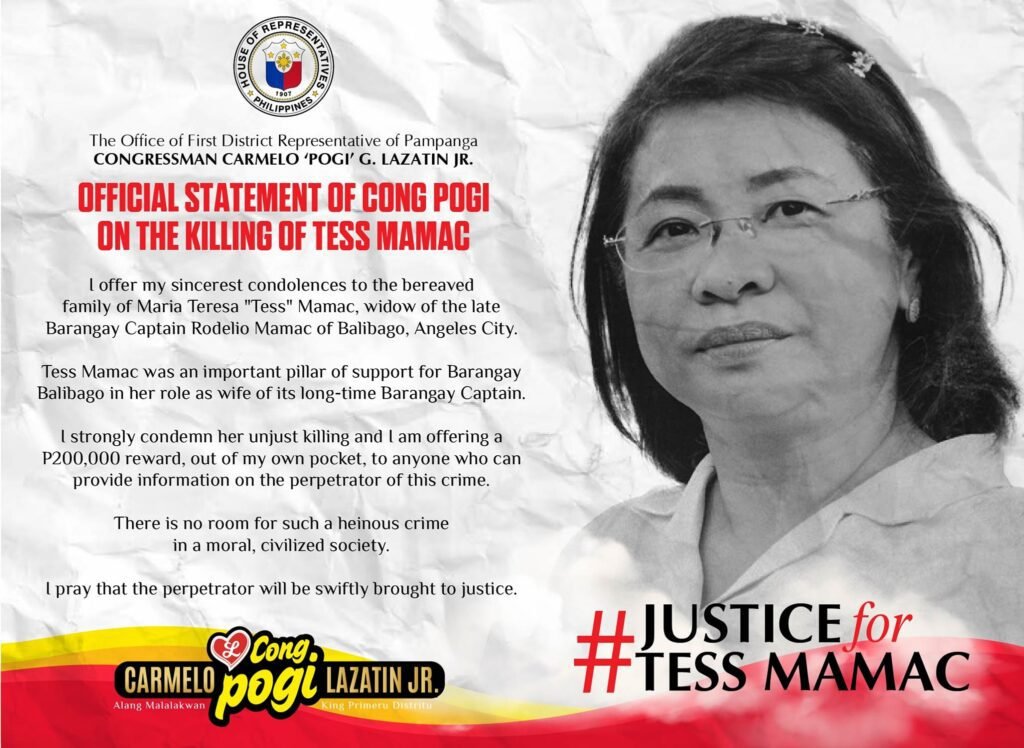 In an official statement, Lazatin extended his condolences to the bereaved family, describing Mamac as a pillar of support for Barangay Balibago during her time as the spouse of its long-serving barangay captain. He strongly denounced the killing, calling it a heinous crime that has no place in a moral and civilized society.