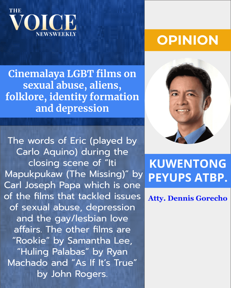 The words of Eric (played by Carlo Aquino) during the closing scene of “Iti Mapukpukaw (The Missing)” by Carl Joseph Papa which is one of the films that tackled issues of sexual abuse, depression and the gay/lesbian love affairs. The other films are “Rookie” by Samantha Lee, “Huling Palabas” by Ryan Machado and “As If It’s True” by John Rogers.