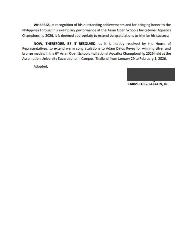 Pampanga 1st District Congressman Carmelo “Pogi” Lazatin, Jr. has filed House Resolution No. 734 congratulating seven-year-old Adam Delos Reyes of Barangay Pandan, Angeles City for winning silver and bronze medals at the 6th Asian Open Schools Invitational (AOSI) Aquatics Championship held from January 29 to February 1, 2026 in Thailand.