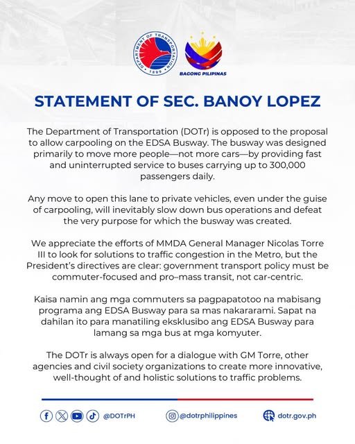 The Department of Transportation (DOTr) has reiterated its opposition to proposals allowing carpooling on the EDSA Busway, stressing that the dedicated lane was designed to move people—not private vehicles.