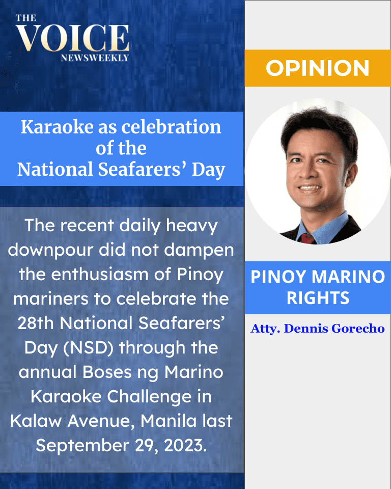 The recent daily heavy downpour did not dampen the enthusiasm of Pinoy mariners to celebrate the 28th National Seafarers’ Day (NSD) through the annual Boses ng Marino Karaoke Challenge in Kalaw Avenue, Manila last September 29, 2023.
