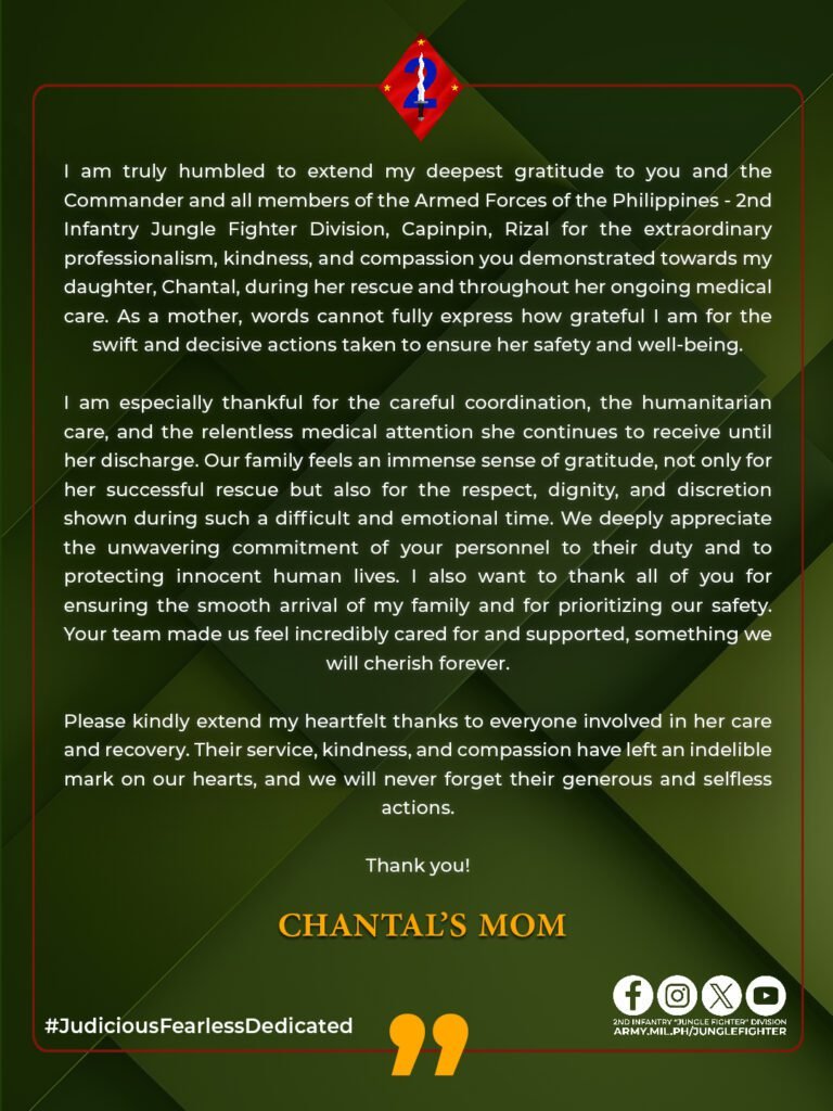 In a message sent to Col. Michael Aquino, 2ID Spokesperson and Public Affairs Office Chief, Mrs. Anicoche praised the professionalism, compassion, and humanitarian care extended to her daughter from the time of her rescue until her medical recovery. With her consent, the message was made public.