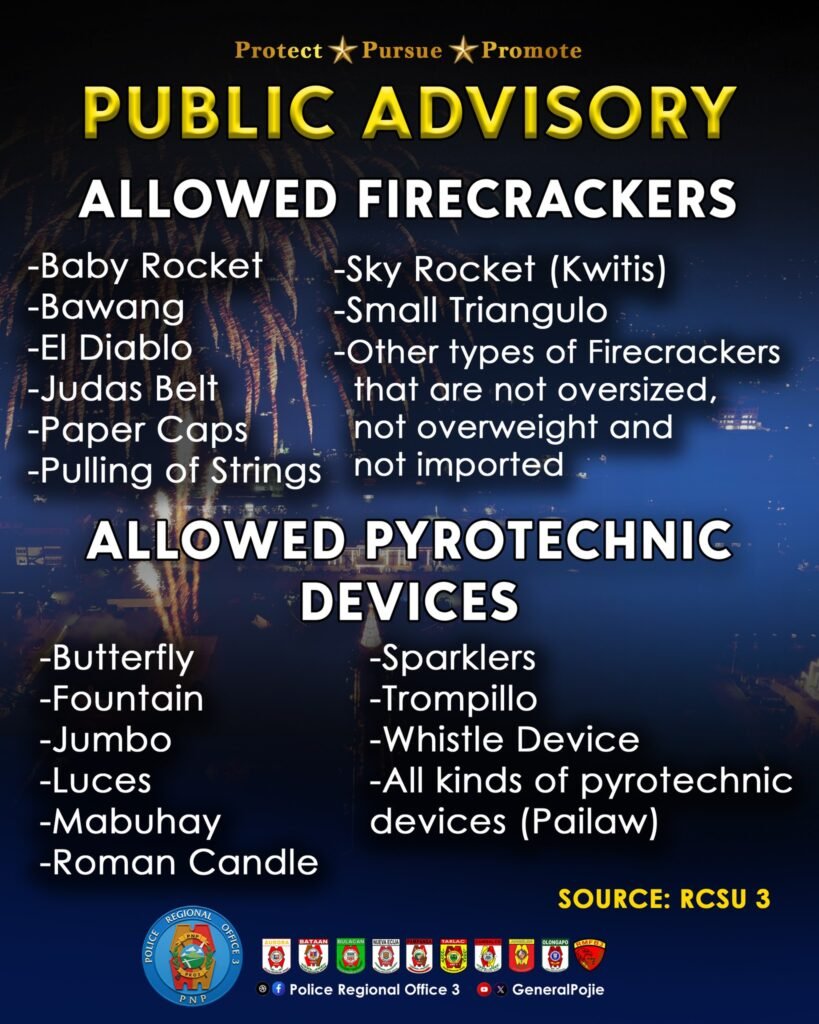 The Police Regional Office 3 (PRO3), through the Regional Civil Security Unit (RCSU-3), has released a public advisory on allowed and prohibited firecrackers and pyrotechnic devices as part of its intensified Ligtas Paskuhan Campaign, which is aimed at ensuring a safe, orderly, and injury-free holiday celebration across Central Luzon.