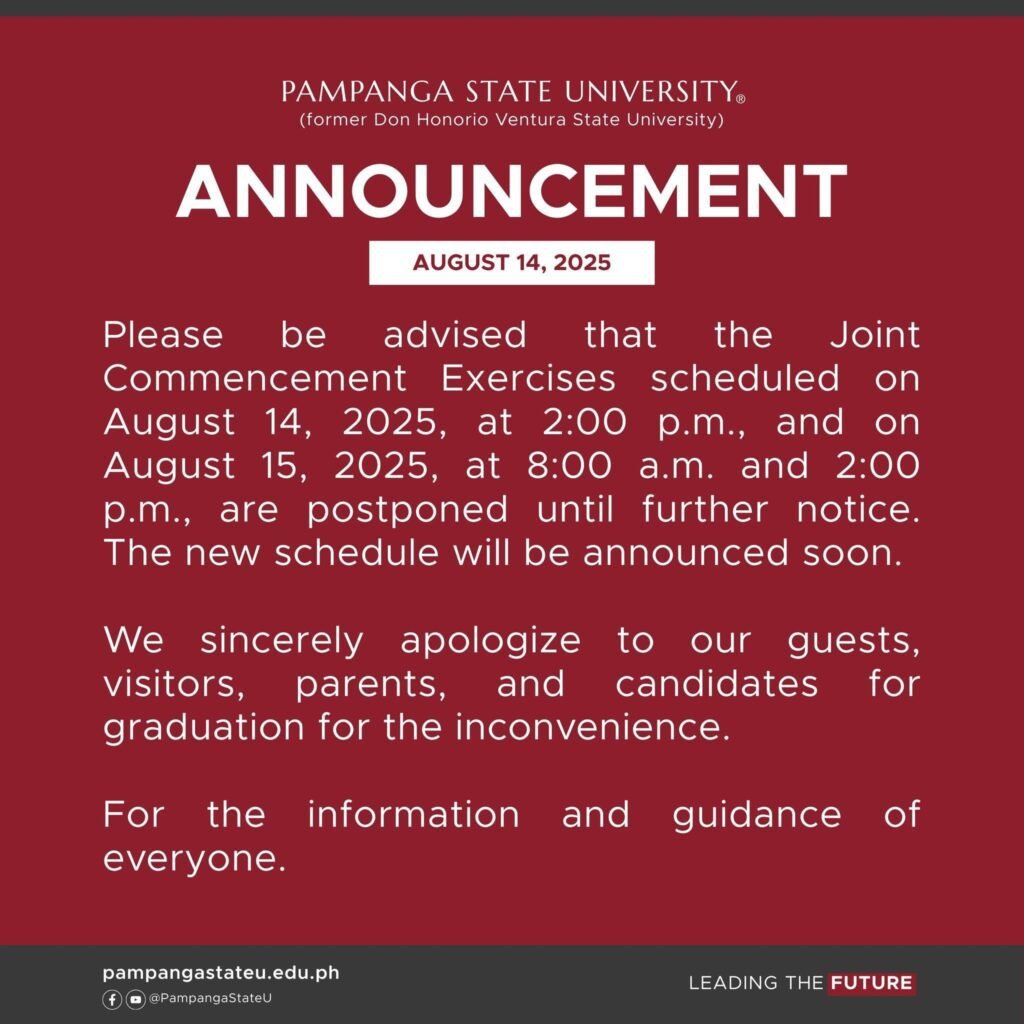 Pampanga State University (PSU) has postponed its scheduled graduation ceremonies on August 14 and 15 following a reported bomb threat.