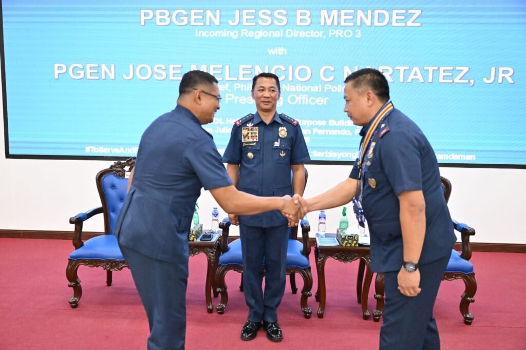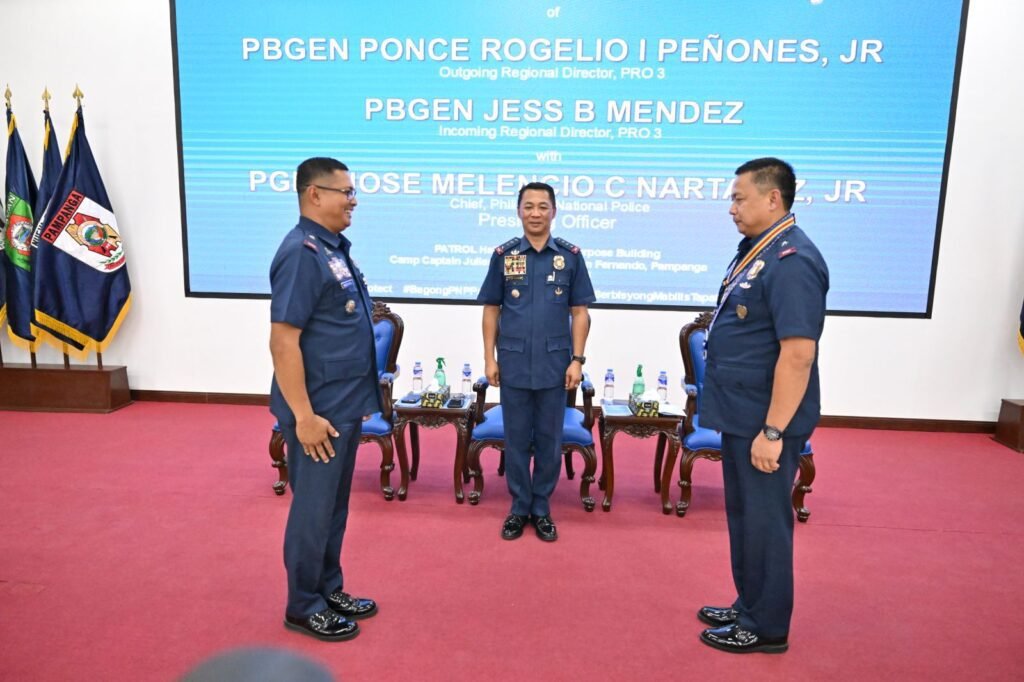 The ceremony marked the transition of leadership from PBGEN Ponce Rogelio I. Peñones Jr. to PBGEN Jess B. Mendez, ensuring continuity in peace and order efforts across Central Luzon.