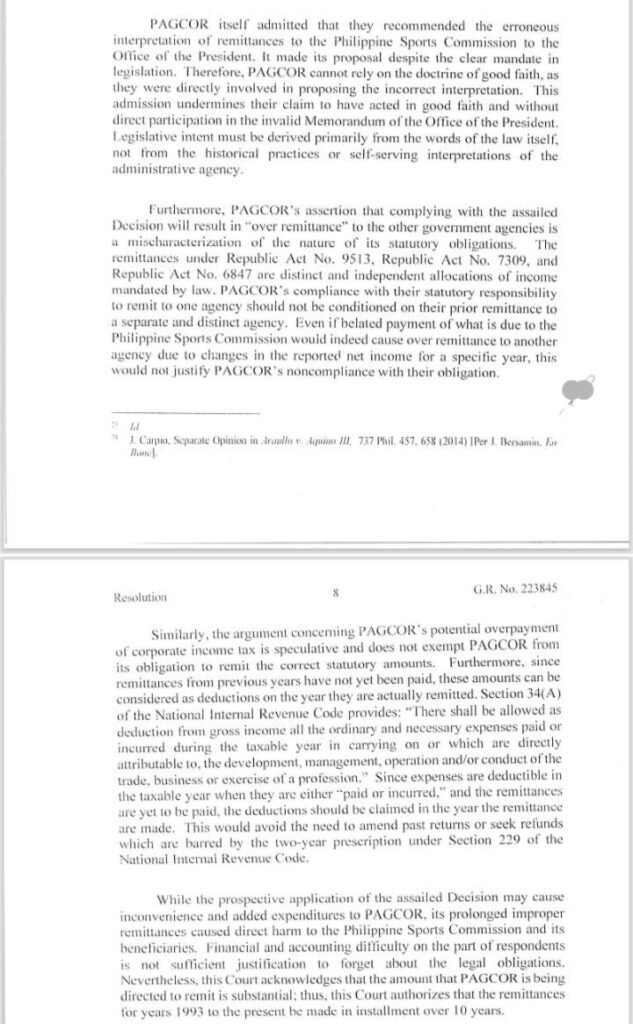The Supreme Court has ordered the Philippine Amusement and Gaming Corporation (PAGCOR) and the Philippine Charity Sweepstakes Office (PCSO) to submit detailed annual reports on the amounts owed and the actual remittances made to the Philippine Sports Commission (PSC)—covering 1993 to the present for PAGCOR and 2006 to the present for PCSO.
