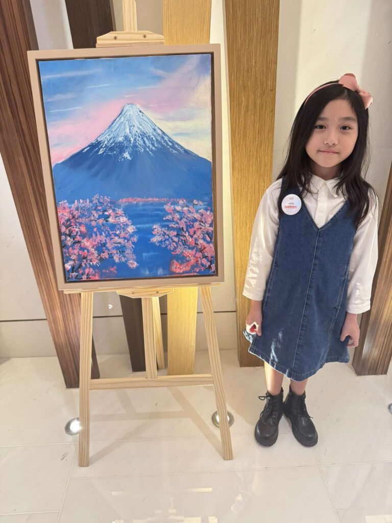 The exhibit showcases 35 artworks created by 28 young artists aged 3 to 18, each reflecting the creativity, imagination, and unique perspectives of budding painters from the Cups and Canvases community.