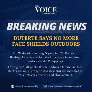 On Wednesday evening, September 22, President Rodrigo Duterte said face shields will not be required outdoors in the Philippines.