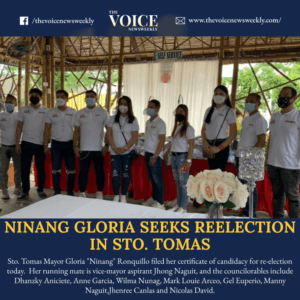 Sto. Tomas Mayor Gloria “Ninang” Ronquillo filed her certificate of candidacy for re-election today. Her running mate is vice-mayor