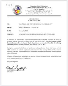 Angeles City Mayor Carmelo “Pogi” Lazatin, Jr. issued today, January 15, Memorandum No. 105, Series of 2022, or the Declaration of Academic Health Break in Angeles City in all public and private schools for all levels, including all teaching and non-teaching personnel, from January 17 to 21, 2022.