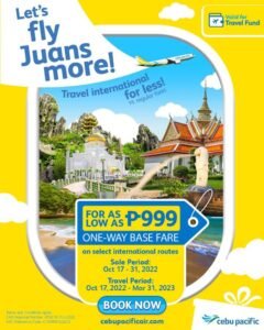 Cebu Pacific (PSE: CEB), the Philippines’ leading airline, encourages everyJuan to fly international as it launches a special seat sale to support those who are raring to travel again to their favorite foreign destinations.