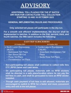 Per Toll Regulatory Board’s directive, the following NLEX-SCTEX toll plazas will be included on the dry run for cashless