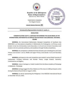 Pampanga First District Representative Carmelo “Pogi” Lazatin, Jr. has filed a resolution commending Casty Santiago, a Grade 5 student from Don Bosco