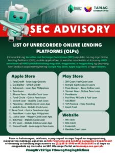 The Securities and Exchange Commission (SEC) reminded the public not to engage with unrecorded Online Lending Platforms (OLPs), including