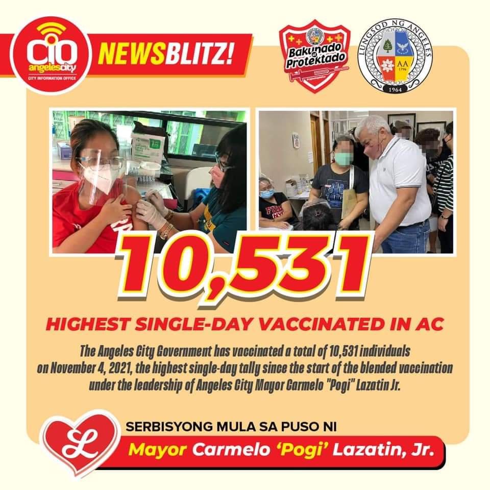 The Angeles City local government, under the leadership of Mayor Carmelo “Pogi” Lazatin, Jr. set a new record of largest number vaccinated in a single day last Thursday, Nov. 4.