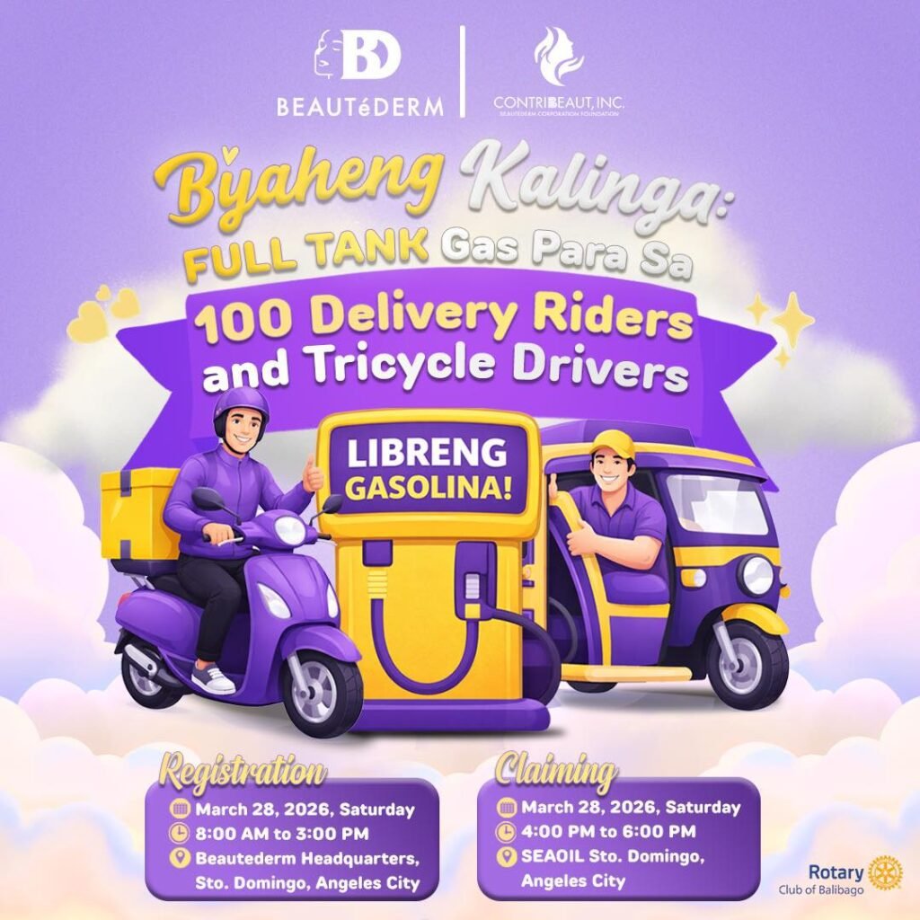 In a heartwarming gesture of gratitude, Angeles City businesswoman and Beautéderm Group of Companies CEO Rei Tan will give away free fuel to 100 delivery riders and tricycle drivers. The initiative, part of the “Biyaheng Kalinga” program, is conducted in partnership with the Rotary Club of Balibago.