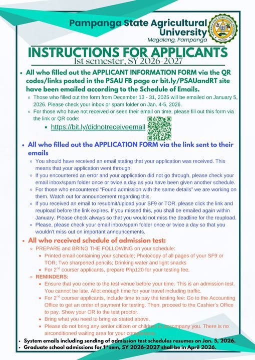 The Pampanga State Agricultural University (PSAU) has issued an admission advisory for applicants for the First Semester of School