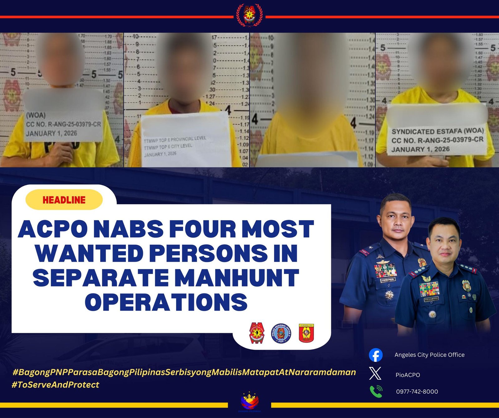 The Angeles City Police Office (ACPO) arrested four Most Wanted Persons in separate manhunt operations conducted on January 1,