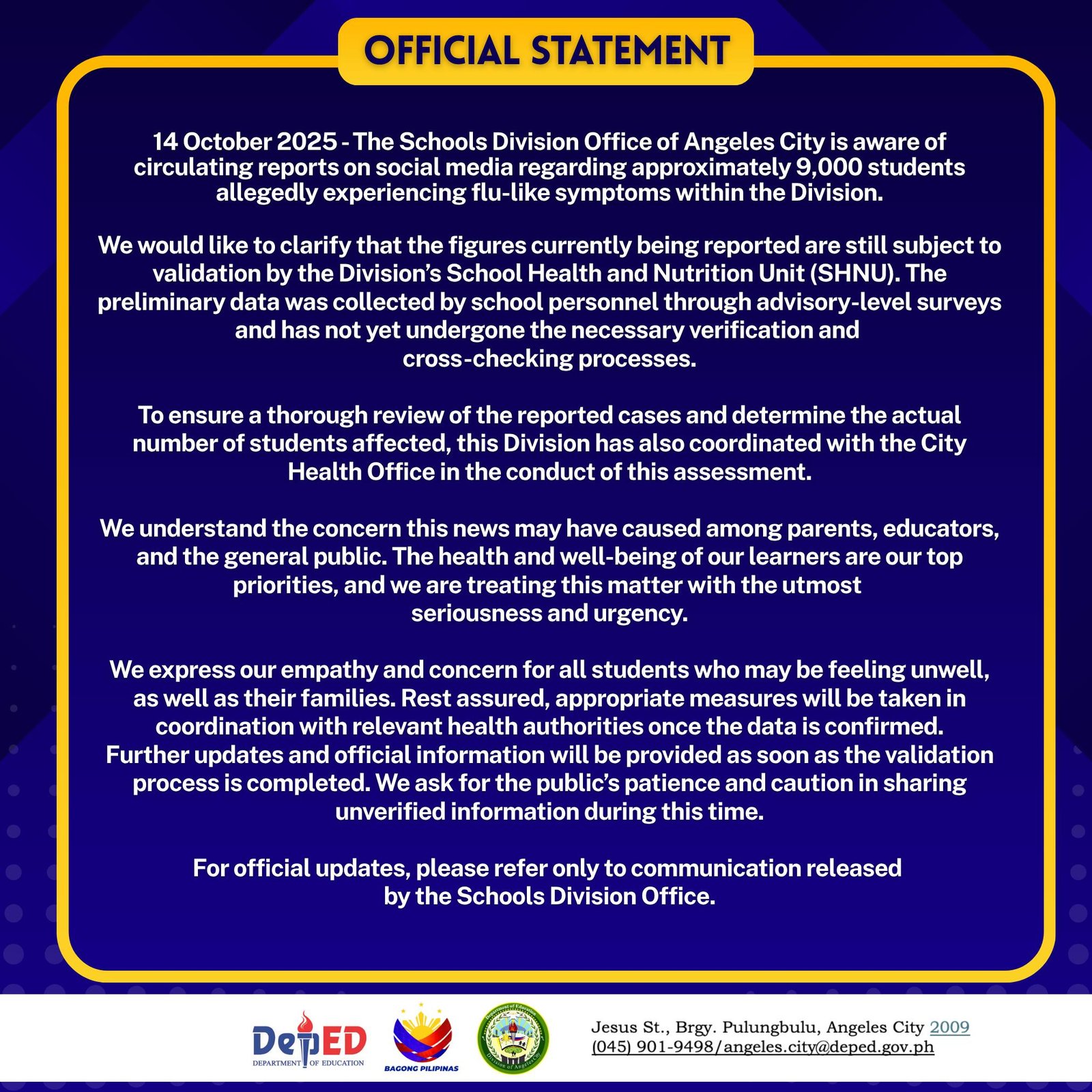The Schools Division Office (SDO) of Angeles City has issued a statement addressing circulating reports on social media claiming