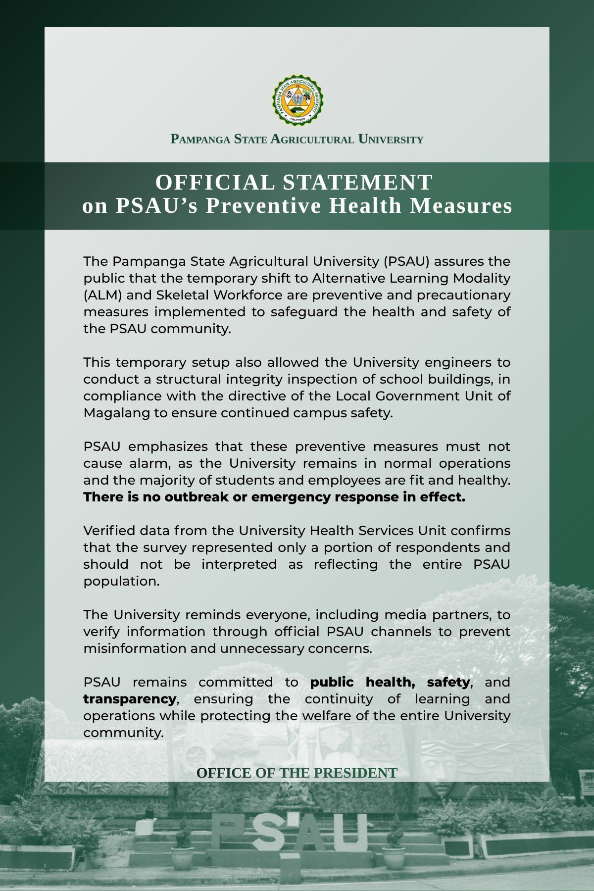 The Pampanga State Agricultural University (PSAU) has assured the public that the campus remains safe and fully operational amid