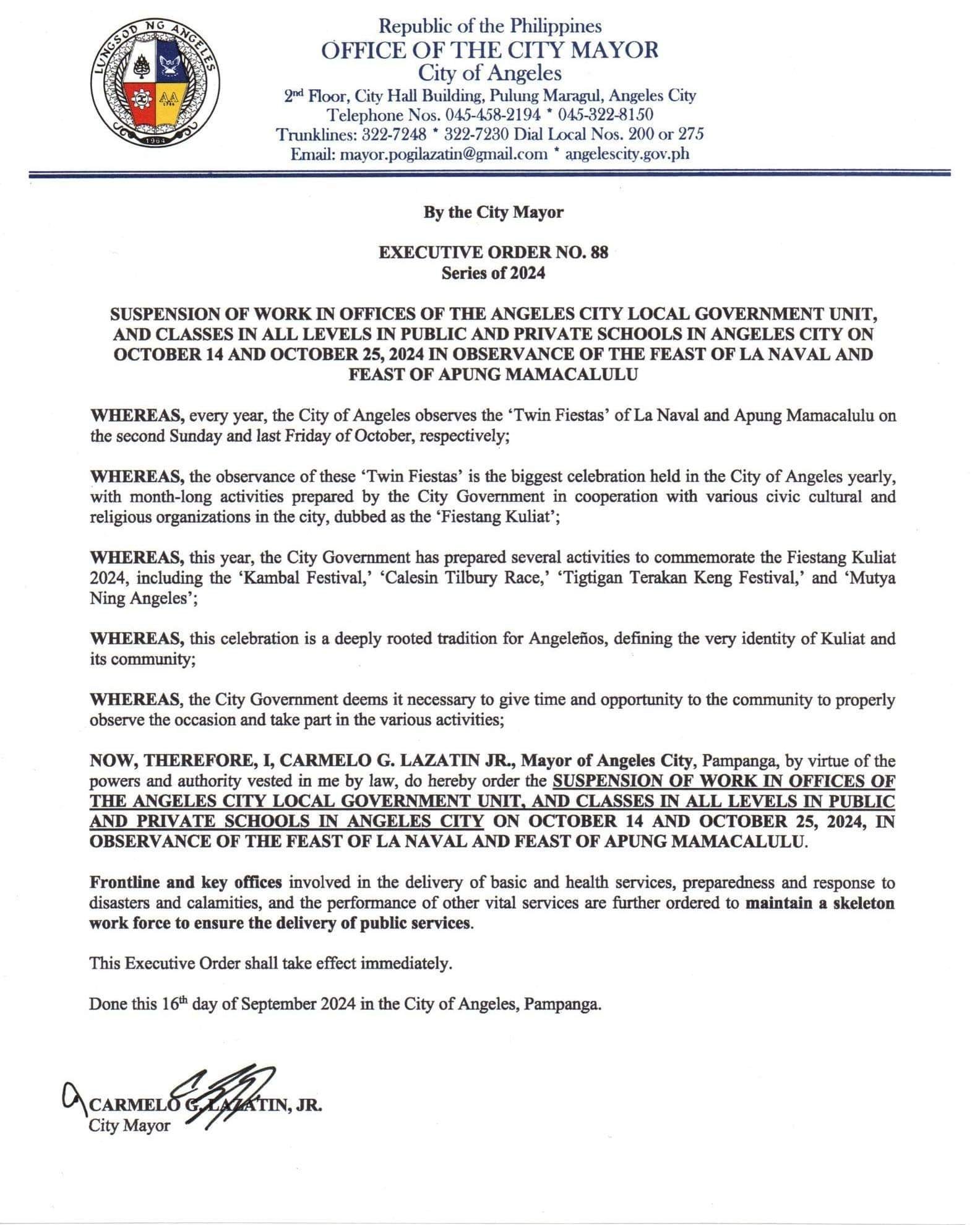 Through Executive Order No. 88, Series of 2024, Mayor Carmelo “Pogi” Lazatin, Jr. has declared the suspension of work
