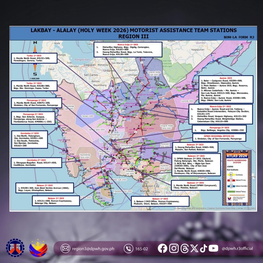 The Department of Public Works and Highways (DPWH) Region III has redeployed 26 Motorist Assistance Centers along key highways in Central Luzon starting 8:00 AM on April 1, 2026, as part of the Holy Week implementation of the Lakbay-Alalay Program.