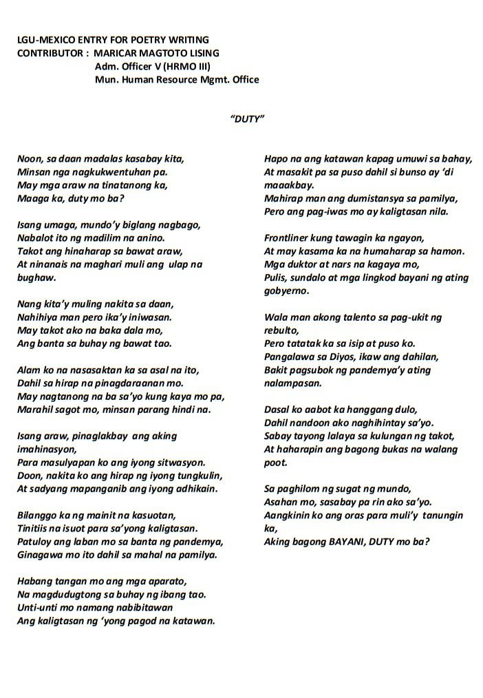 The poem, entitled “Duty,” was written by Maricar Magtoto Lising, a personnel of the Local Government of Municipality of Mexico and was rendered into an audio-visual presentation by the City Government of San Fernando.