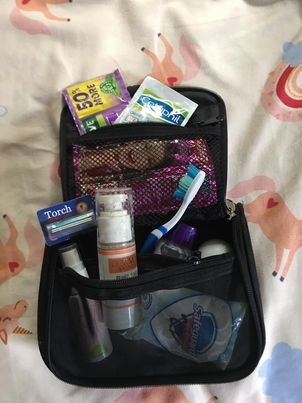 Beauty essentials are also important. Get a small bag where you can put in sachets of shampoo, sunblock, body lotion and moisturizer, toothpaste, a small bar of soap, toothbrushes, sanitary napkin, deodorant and feminine wash.