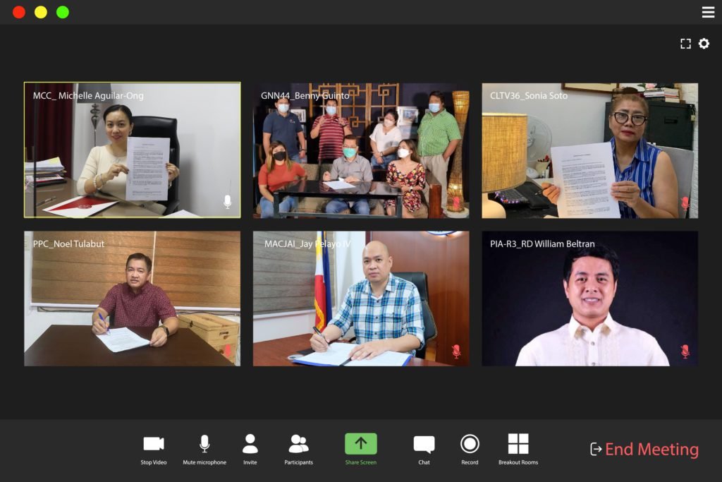 Meanwhile, a Memorandum of Agreement (MOA) was recently signed by all parties comprising the TFCL body. Gracing the virtual MOA signing are MCC President Michelle Aguilar-Ong, PPC President Noel Tulabut, PIA-R3 Director William Beltran, CLTV36 President Sonia Soto, GNN44 (Infomax Inc.) General Manager Benefredo Guinto, and MACJAI President Jay Pelayo IV.