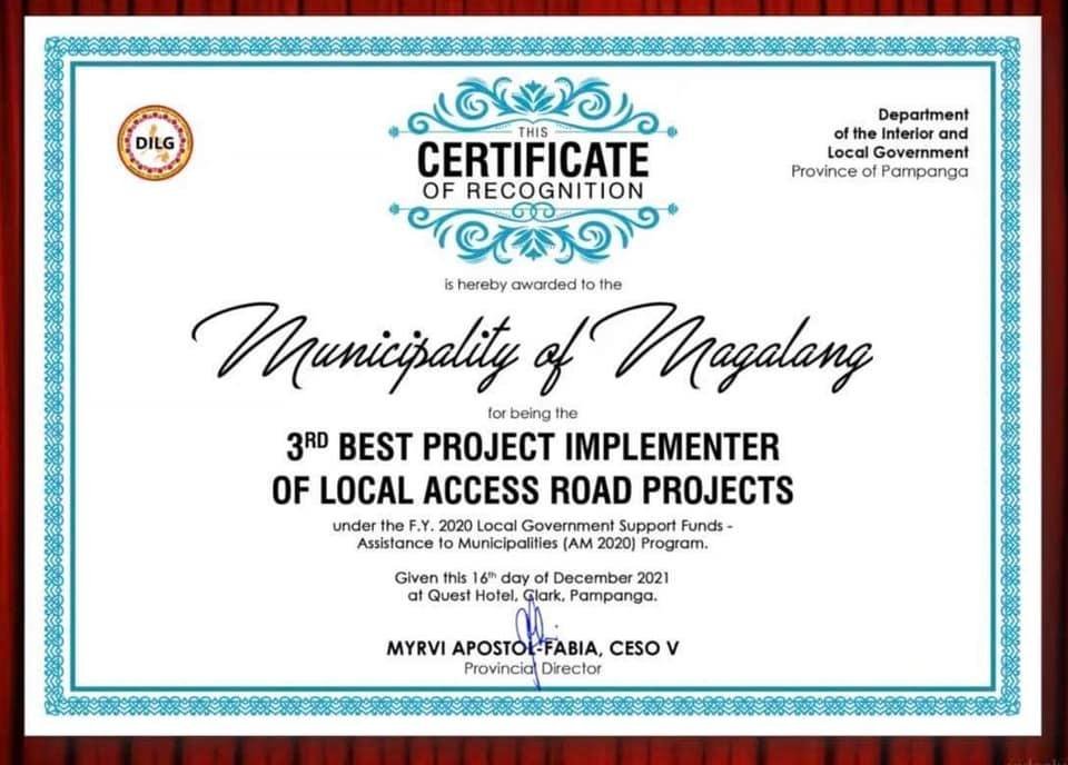Ginawaran ng Department of Interior and Local Government (DILG) ang Lokal na Pamahalaan ng Magalang sa pangunguna ni Mayor Romulo “Romy” Pecson , bilang isa sa mga Top Permorming LGU sa buong Probinsiya ng Pampanga, 16 Disyember 2021.