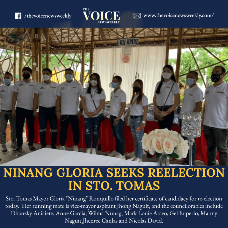 Sto. Tomas Mayor Gloria “Ninang” Ronquillo filed her certificate of candidacy for re-election today.