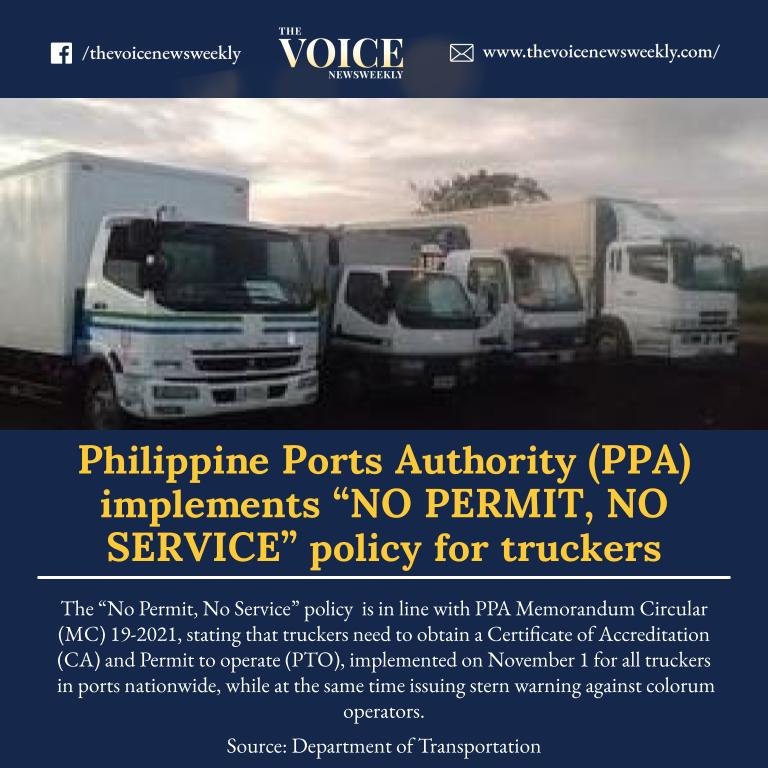 The “No Permit, No Service” Policy is in line with PPA Memorandum Circular (MC) 19-2021, stating that truckers need to obtain a Certificate of Accreditation (CA) and Permit to Operate (PTO), otherwise are not allowed to transact at port terminals. The PPA implements the policy as some truckers still refuse to secure the CA and PTO.