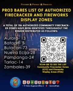 The Police Regional Office 3 (PRO3) has released the official list of authorized community firecracker selling zones and fireworks