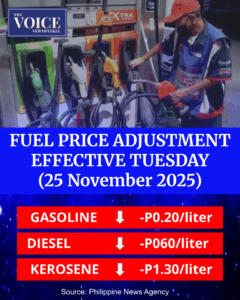 Gasoline prices will drop by ₱0.20 per liter on Tuesday, November 25, ending seven consecutive weeks of increases. Diesel,