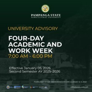 The Pampanga State Agricultural University (PSAU) announced that it will adopt a Four-Day Academic and Work Week starting the