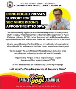 Pampanga First District Representative Carmelo “Pogi” Lazatin, Jr. has expressed his full support for the appointment of Department of